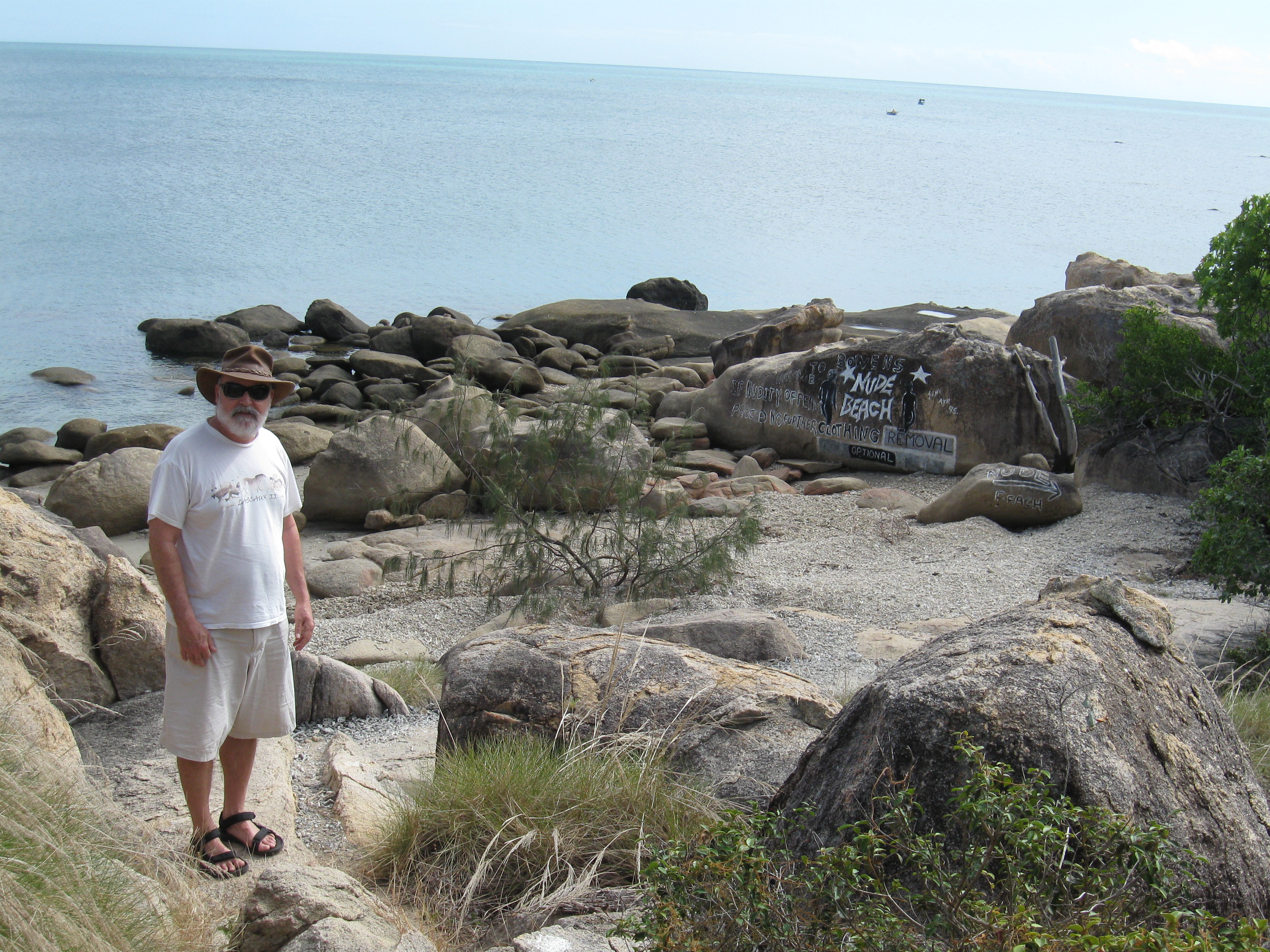 | One trail we've already checked out is the one to coral bay, which is also the only "clothes optional" beach in Bowen. In order to keep outsiders from being "offended" and getting shut down, they have a very nicely painted rock before you get to the beach. Here is Steve examining the quality of the rock art. |