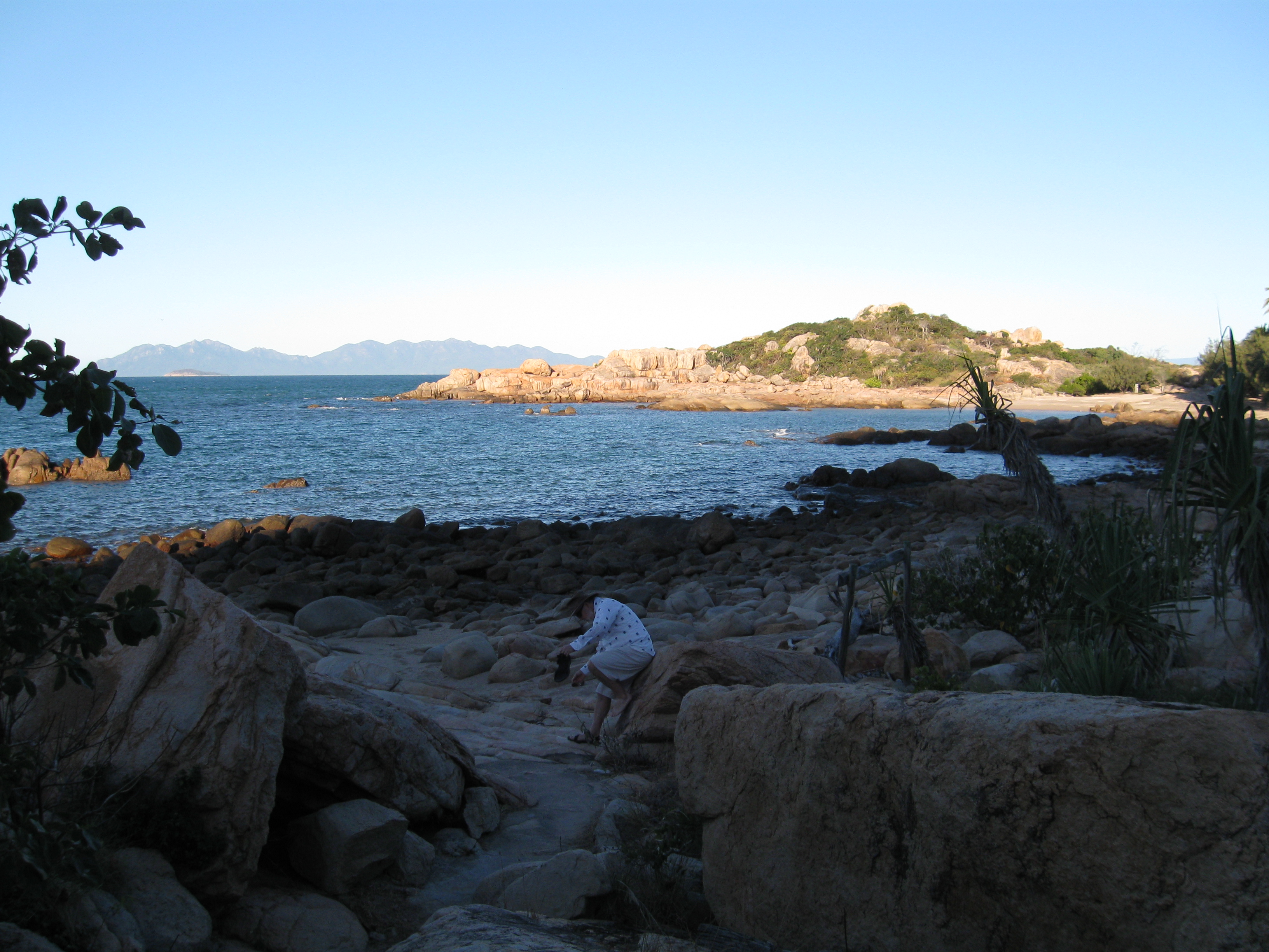 This is what the coast looks like, with Jan for scale. It is a big boulder beach then a steep slope covered with tropical bush plus hoop pines and other uniquely Aussi vegetation. There was actully quite a bit of storm damage from Cyclone Ului which came ashore North of here on March 22nd. The vegetation is adapted to this sort of thing but a few big trees had still come down and some other trees lost their vegetation. It had recovered well after just a couple of months. |