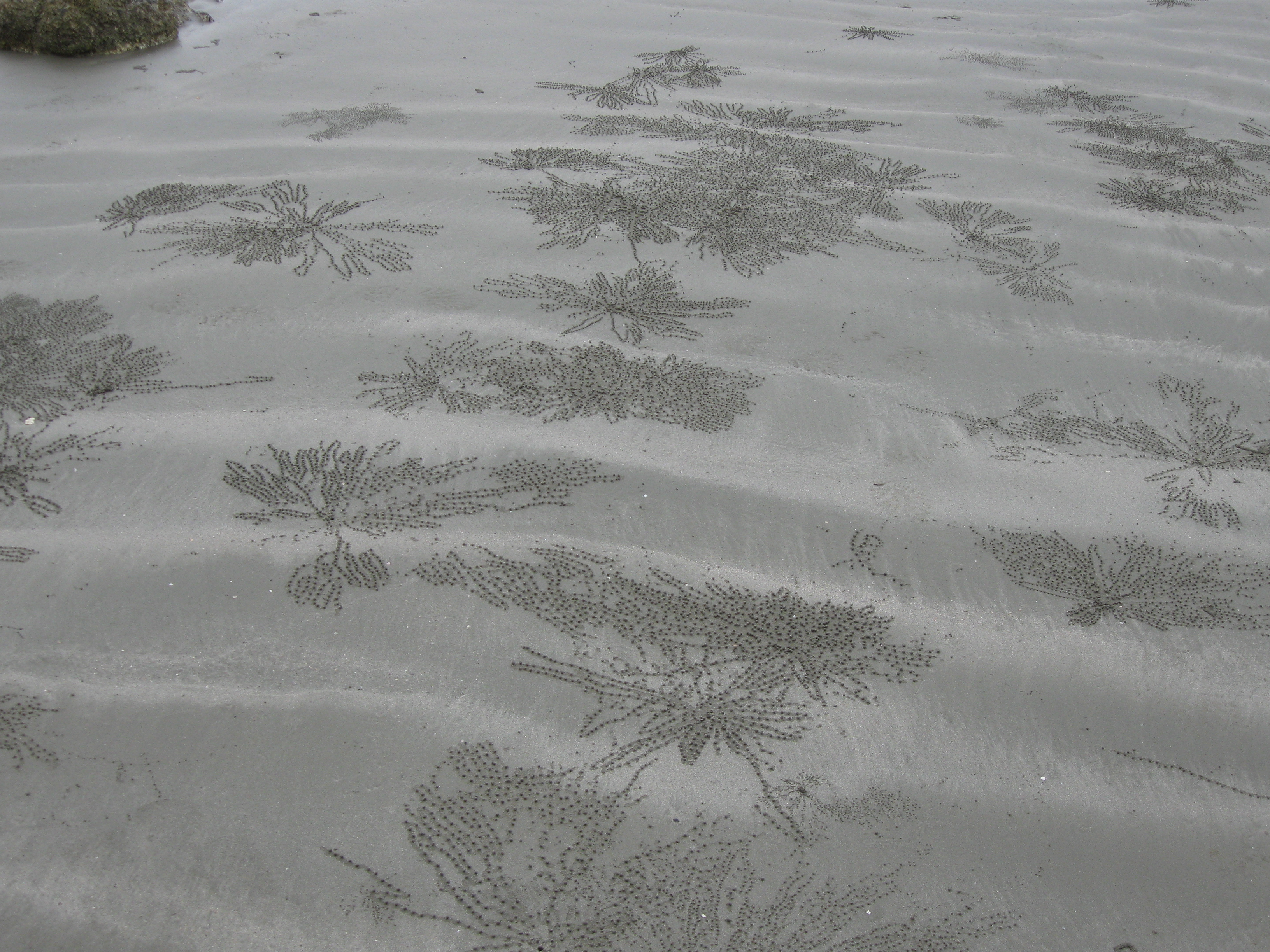 | One of the things to see while you are trekking across the beach below the high tide line is beautiful patterns made by tiny crabs using little balls of sand. Each time the tide goes out they start their art project again, and each time the tide comes in the art all gets washed away. |