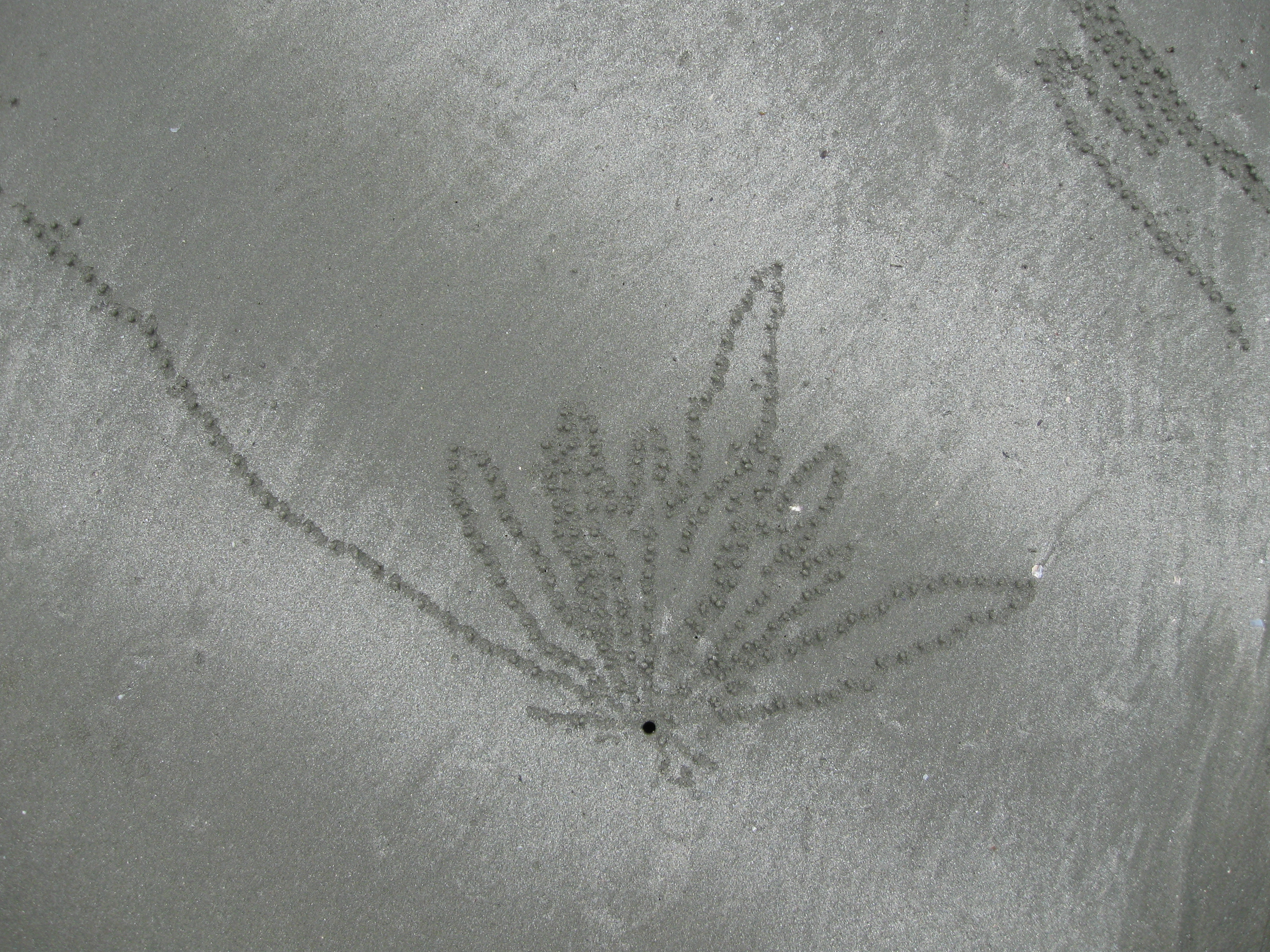 | We don't know why they do it, but the entire beach is covered in some places by their amazing designs. In this closer version you can see the little hole where one crab emerges to do the sidewalk art. These same crabs are found on other beaches in these parts, so it isn't just here. Millions of crabs doing their artwork over and over each day. |