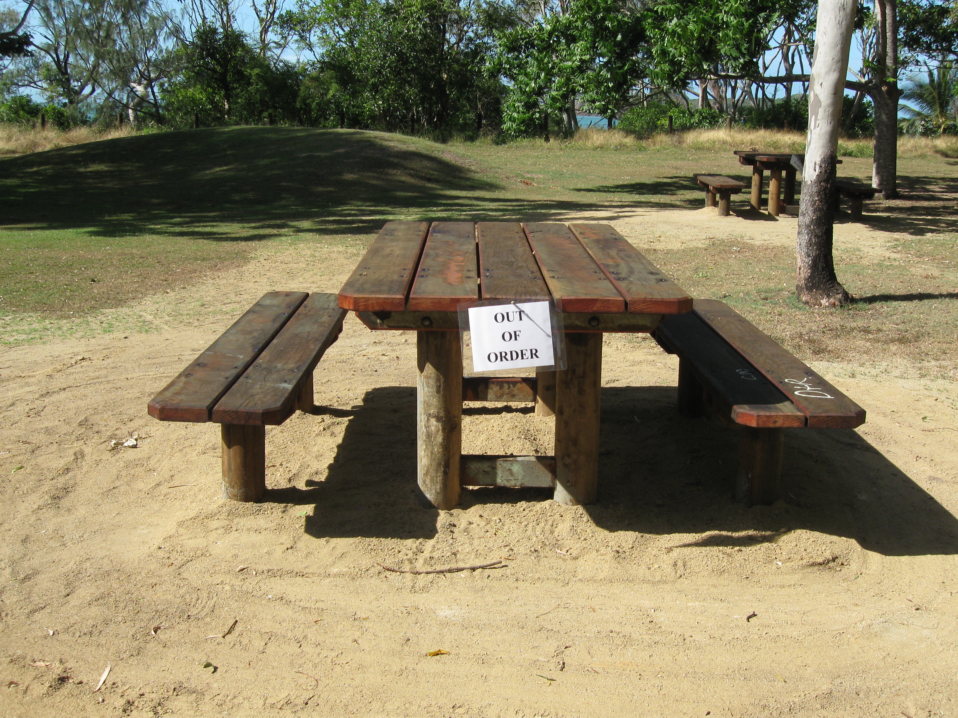 | Although the cyclone damage has been mostly repaired here, it was worse further North where the winds were stronger. However, there were a few local services which have yet to be fully restored. The picnic area had been spruced up but a few things weren't yet online. Readers are encouraged to click on the photo to enlarge is and figure out what the problem might be. All suggestions welcome. (This is part of my funny Australian signs series -- they do have a way with signs sometimes). |