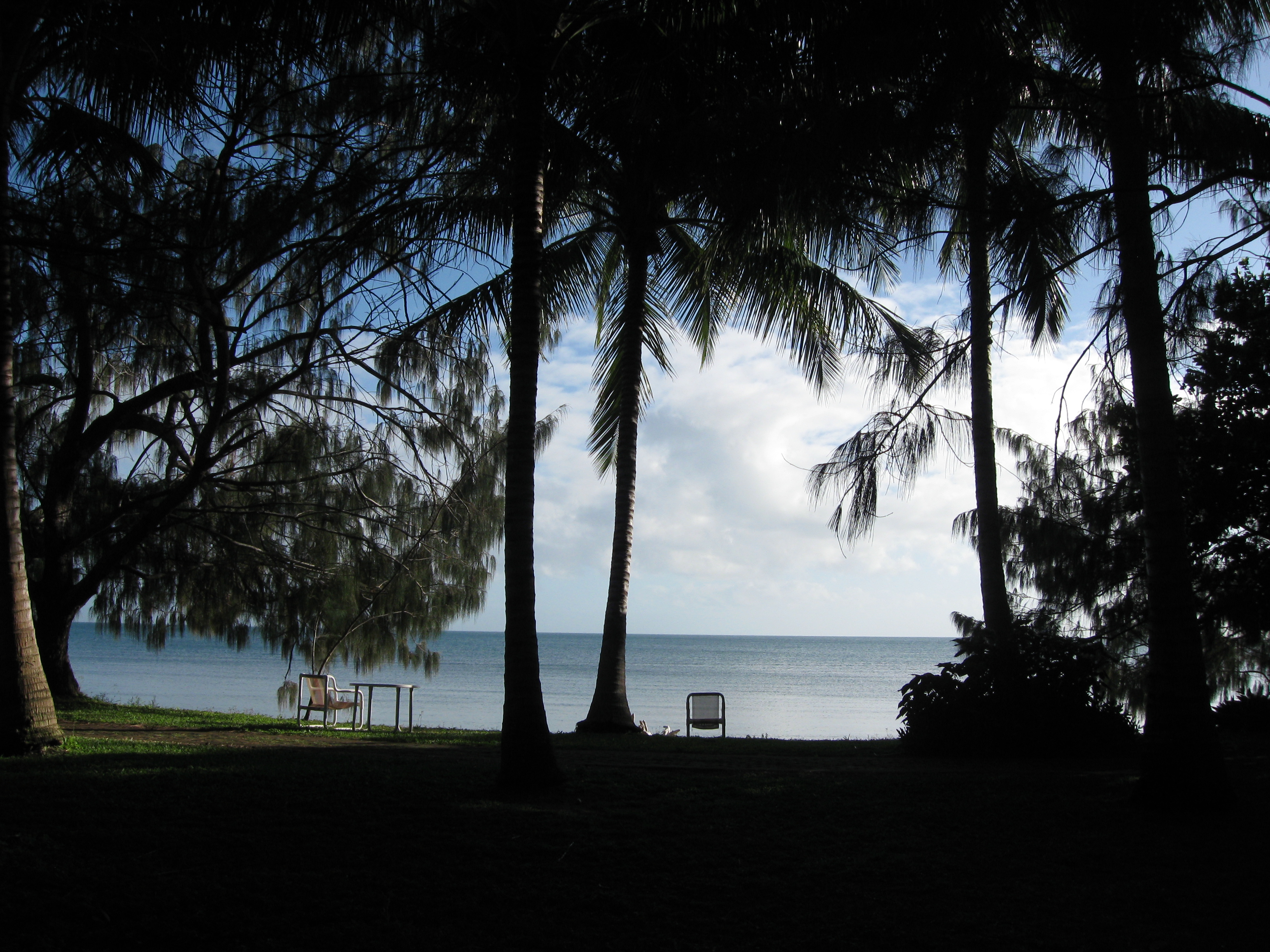 | After a nice week at Cape Hillsborough we headed up to another favourite place: Bowen. This is the chair from which I was typing (well, for a moment, but you can't see the screen in the glare so I moved back inside). We have been here for one week and are staying in Bowen for another. I didn't move back inside Trev our vehicle either. We rented a little unit by the sea. Luxury. We don't have to put the bed planks away to get to the food cupboard each morning. We're actually moving to a different unit tomorrow so we will be closer to our favourite beach Horseshoe Bay. At the moment we half to walk a quarter of an hour to get there. |