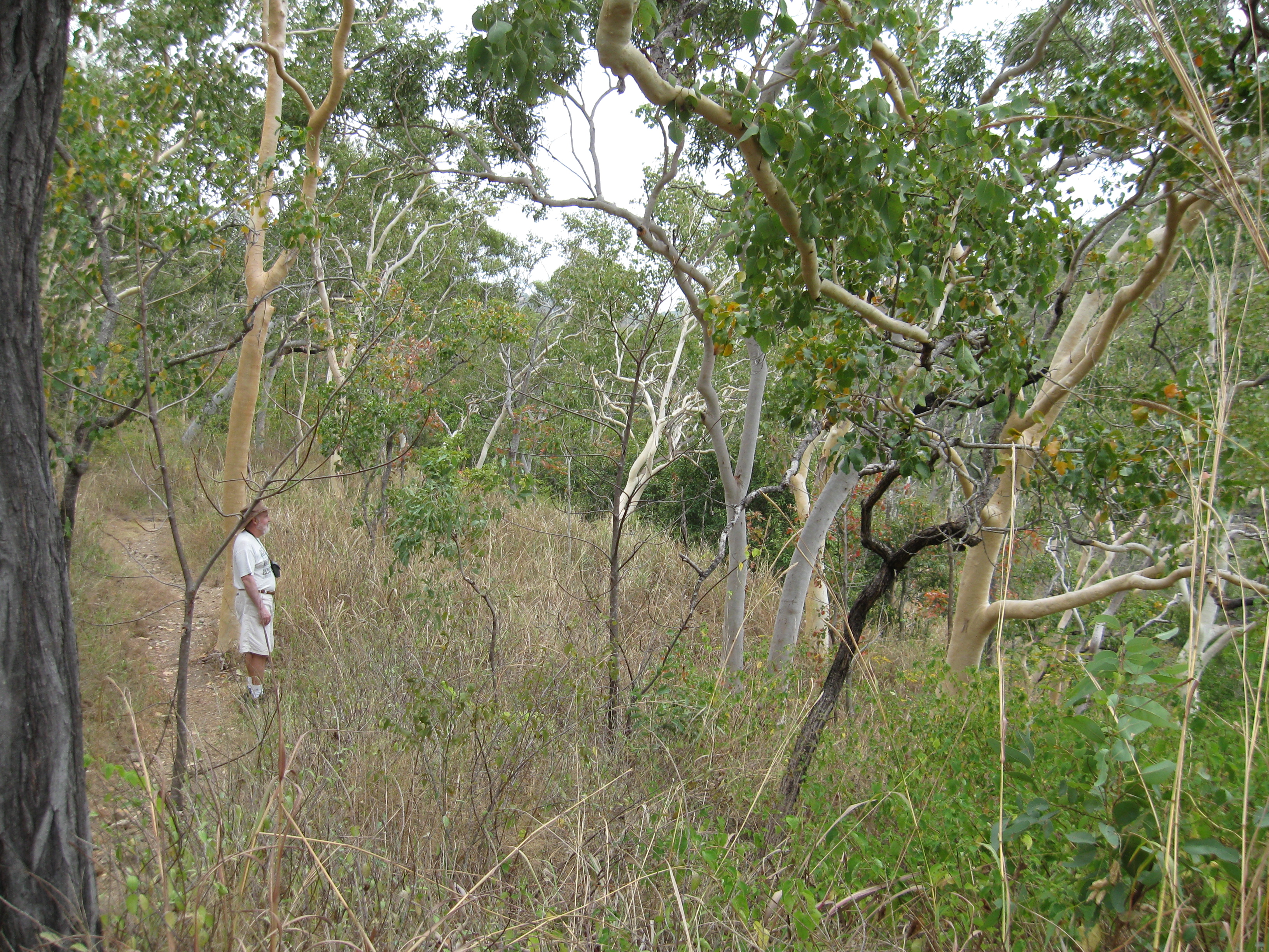 intrepid explorer gazing out through the drier forest down into the creek where the tropical rainforest