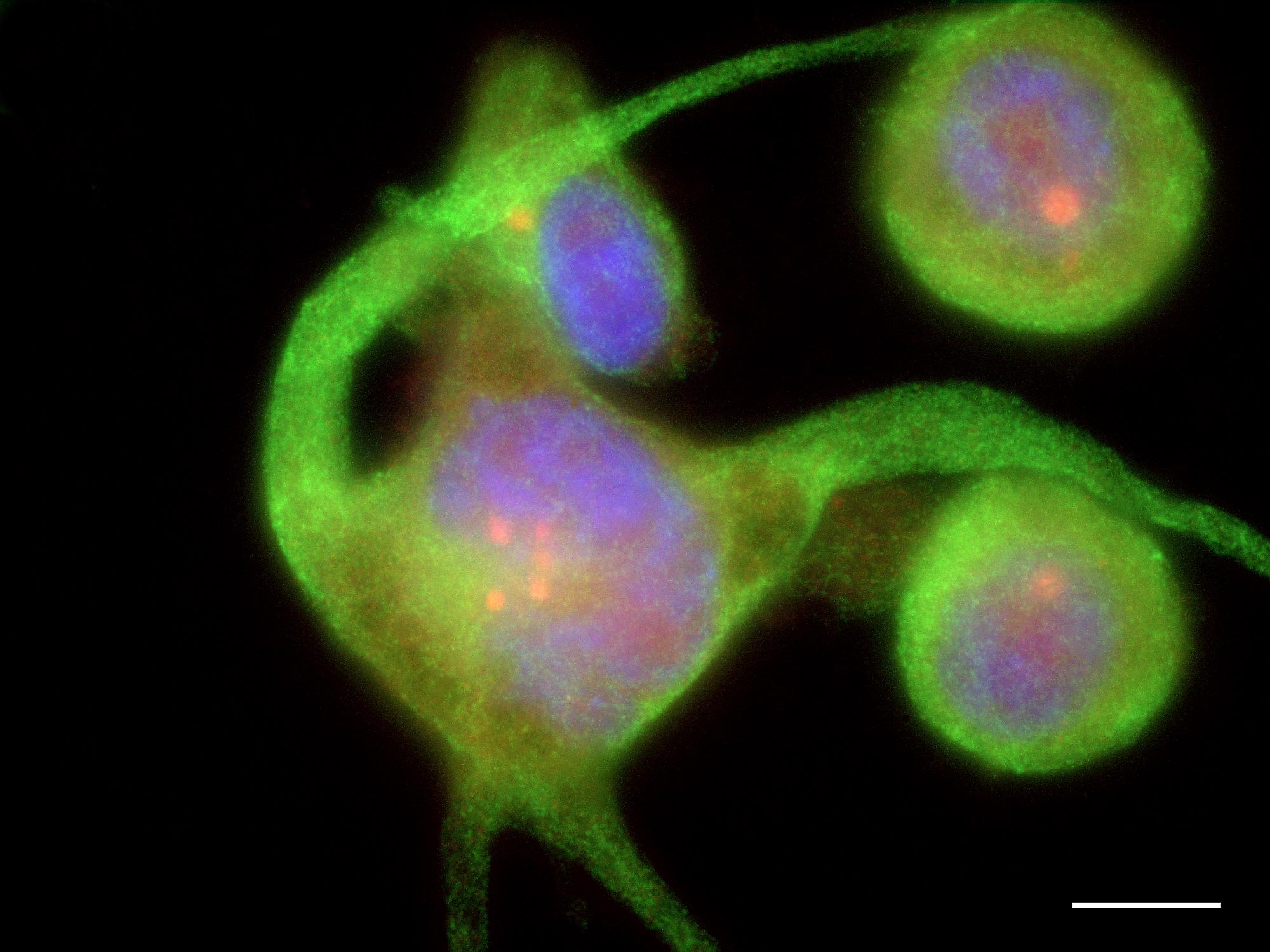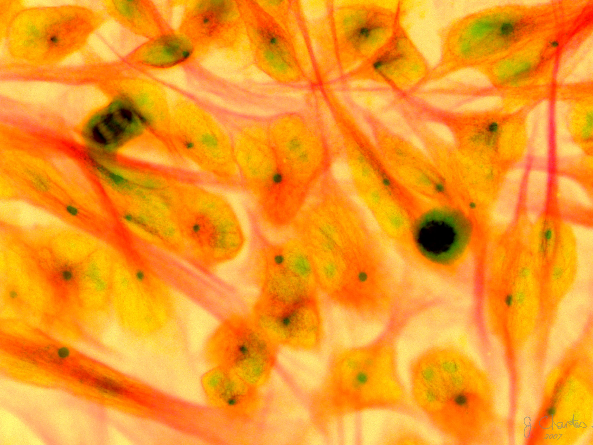 That my research into melanoma led to fluorescence and confocal microscopy was an unexpected treat. In addition to documenting my work, there were artistic marvels to be seen, if not directly at the microscope, then later, when the separate colour channels were merged. I believe that the award I received from the BIRU for the best microscopy image of 2006 was due in part to the artistic merit of the image I submitted, not merely to the depiction it gave of an important biological process. That image, "Constellation" can be seen at the bottom of the introduction page of this website, but I've included another two fluorescence microscopy images here, "Rhythmic gymnastics", and "For Debbie", an abstraction created by request for a colleague. That there is beauty to be found even within terrible disease is as surprising as it is disturbing.