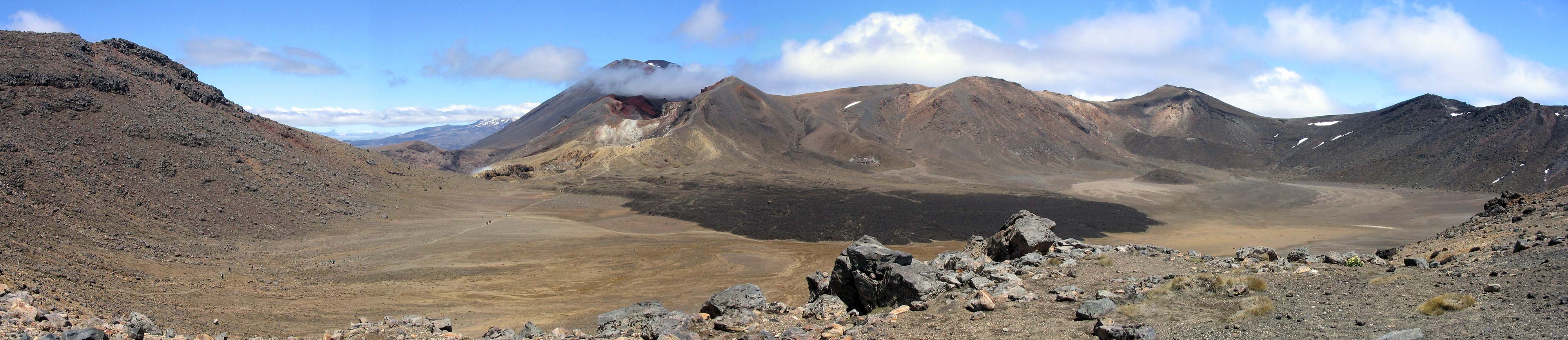 I've traversed the Tongariro Crossing many times; its reputation as the best one day walk in the world is easily justified. A trail through an alpine valley with a forest a thousand years old, but less than knee-high, punctuated with incredible flowering herbs, buttercups, daisies, and orchids, follows a quick stream to an old lava flow. The climb reveals a desolate moonscape, devoid of all but the hardiest plants and lichens, with the prefect cone of Ngauruhoe towering above. Another climb, and the edge of Red Crater is achieved, with its amazing colourations, and a vista across a volcanic plain to a circular lake of pure blue. Then, down the steep flank of Red Crater, past the small Emerald Lakes there, across the plain, and up to the rim of Blue Lake itself, where a glance behind reveals the amazing spectacle of the cone of Red Crater, the peak of Ngauruhoe, and the distant bulk of Ruapehu perfectly aligned. The descent then begins, through tussock and fern, past the Ketetahi hot springs, and down to a lower altitude than the beginning of the walk, with forest becoming taller and richer as the more salubrious climatic conditions allow.