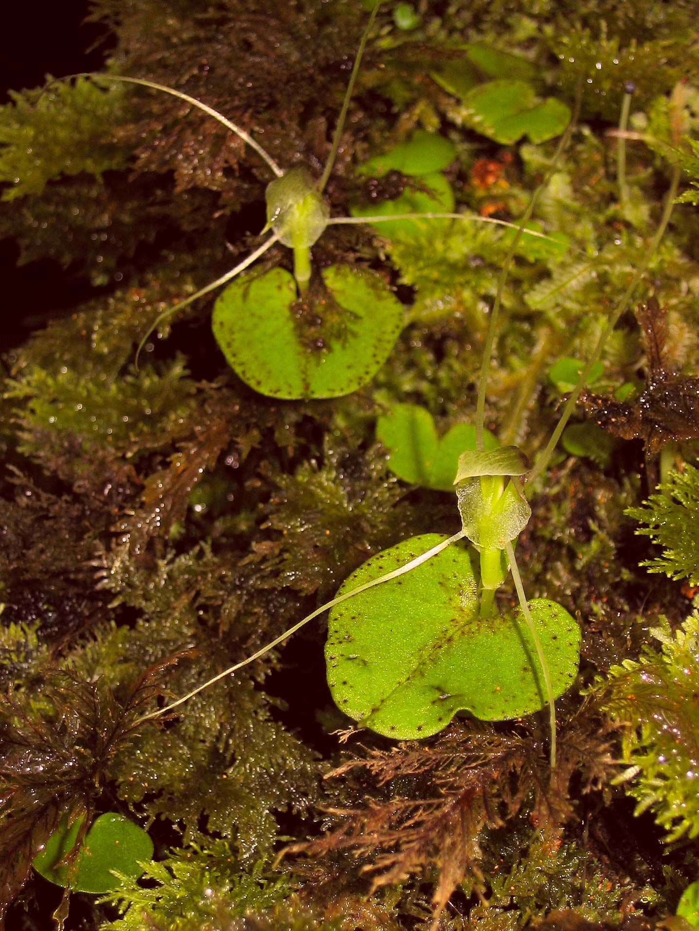 For the most part, the orchids of New Zealand do not have the large showy flowers of the popular commercial cultivars from the tropical or sub-tropical regions. The plants themselves can be quite unobtrusive: the pixie cap orchid (Acianthus fornicatus) is only about 1 cm tall from the ground to its single small leaf, but it carries a spray of 5-10 flowers to five times that height. The spider orchids (Nematoceras and Corybas) are similar in size overall, but instead carry a single relatively huge flower. These tiny plants are often overlooked, even by those who enjoy spending time in the forests, but when one begins to recognise them, and takes the time to inspect them closely, all of the complex structure and beauty of their more flamboyant cousins is there to be found, but in miniature.